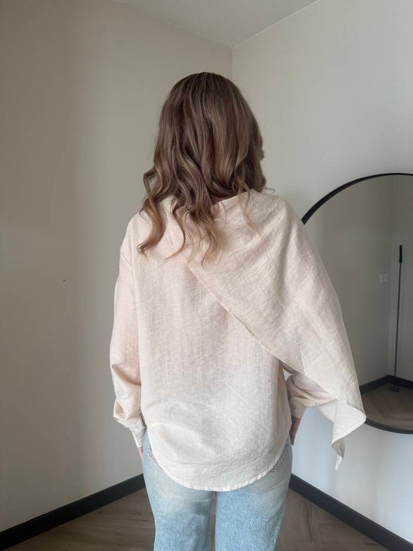 De blouse heeft een lage hals met een hele mooie achterkant .Sluit d.m.v. knopen.Combineer de blouse zoals op de foto met broek Lot.